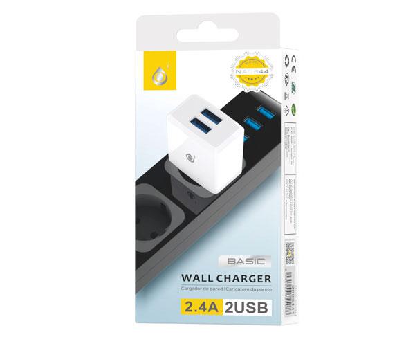 CARGADOR DE RED 2 PUERTOS USB CON CARGA RAPIDA COLOR: BLANCO ENTRADA: 110-240V, 50-60HZ SALIDA: 5V / 2.4A USB: 2