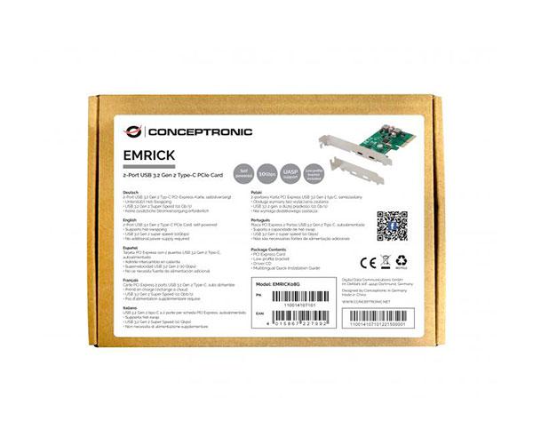 CONTROLADORA CONCEPTRONIC PCI EXPRESS 2 PUERTOS USB 3.2 EMRICK 08G Esta tarjeta PCI Express le permite agregar fácilmente 2 puertos SuperSpeed ??USB 3.2 Gen 2 adicionales a su computadora de escritorio. Tiene una velocidad de datos máxima de 10 Gbs, lo que lo hace muy rápido y capaz de copiar archivos o documentos grandes hacia y desde su computadora de escritorio. Simplemente coloque la tarjeta PCI Express USB 3.2 Gen 2 en la ranura Express Card de su computadora, instale los controladores incluidos y ¡listo! *No es compatible con la ranura PCI-Express x1 – Agregue 2 puertos USB-C a su computadora de escritorio – USB 3.2 Gen 2 supervelocidad (10 Gbps) – No requiere fuente de alimentación adicional – Admite intercambio en caliente – Soporta UASP Sistemas operativos compatibles Windows: